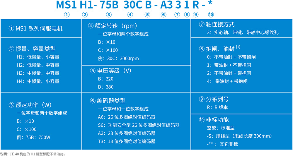 • 更高转速:MS1H1 和 MS1H4 (40/60/80 机座 ) 最高转速从 6000rpm 提升到  7000rpm;MS1H2 机型最高转速从 5000rpm 提升到 6000rpm;MS1H3(130/180  机座)最高转速从 3000rpm 提升到 4500rpm(说明:带 26 位 &23 位编码器机型)